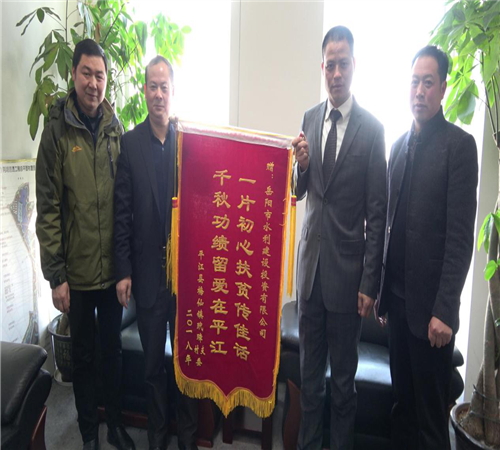 1月22日,平江縣梅仙鎮(zhèn)玳璋村幫扶對象,將一面寫著"一片初心扶貧傳佳話,千秋功績留愛在平江"18個大字的鮮紅錦旗送到市水建投董事長劉寶山、總經(jīng)理楊雄輝的手中,對市水建投對精準(zhǔn)扶貧工作的大力支持表達誠摯謝意。
